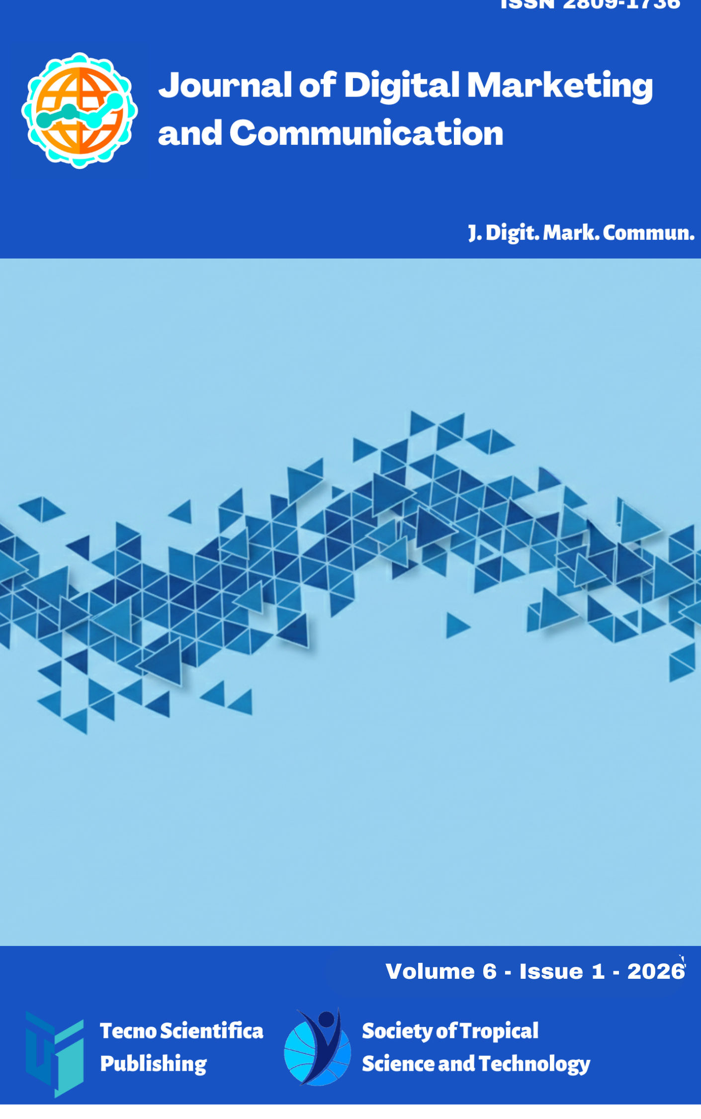 Journal of Digital Marketing and Communication (e-ISSN: 2809-1736) is an international, scientific, peer-reviewed, open-access journal that publishes conceptual papers, empirical studies, and short essays in areas such as social media marketing, communication, digital economy, smart tourism, smart cities, e-business, transmedia storytelling, and other closely related disciplines. The journal is published biannually (June and December) online by Tecno Scientifica and is supported by The Society of Tropical Science and Technology. Open Access — free for readers and authors. High Visibility: indexed within CrossRef, Google Scholar and many other databases. Rapid Publication: manuscripts are peer-reviewed and a first decision is provided to authors approximately 3 weeks after submission. About JDMC journal | All volumes & issues